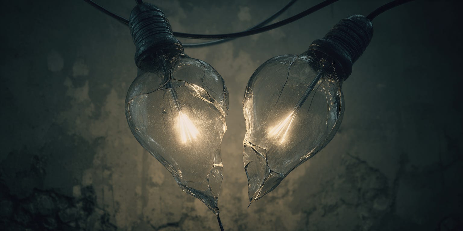 Two broken hearts with the same cracked spark